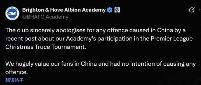 包括眾多中國球迷在內(nèi)的很多熱愛和平的人,對布萊頓足球俱樂部進行了嚴厲指責。布萊頓青訓學院賬號刪除該貼,并于11月29日發(fā)布道歉聲明,就發(fā)布的關于青訓學院參加英超圣誕休戰(zhàn)活動的帖子在中國造成的任何冒犯,深表歉意。“我們非常重視在中國的球迷,絕無冒犯之意?!钡摰狼柑幌拗屏嗽u論。