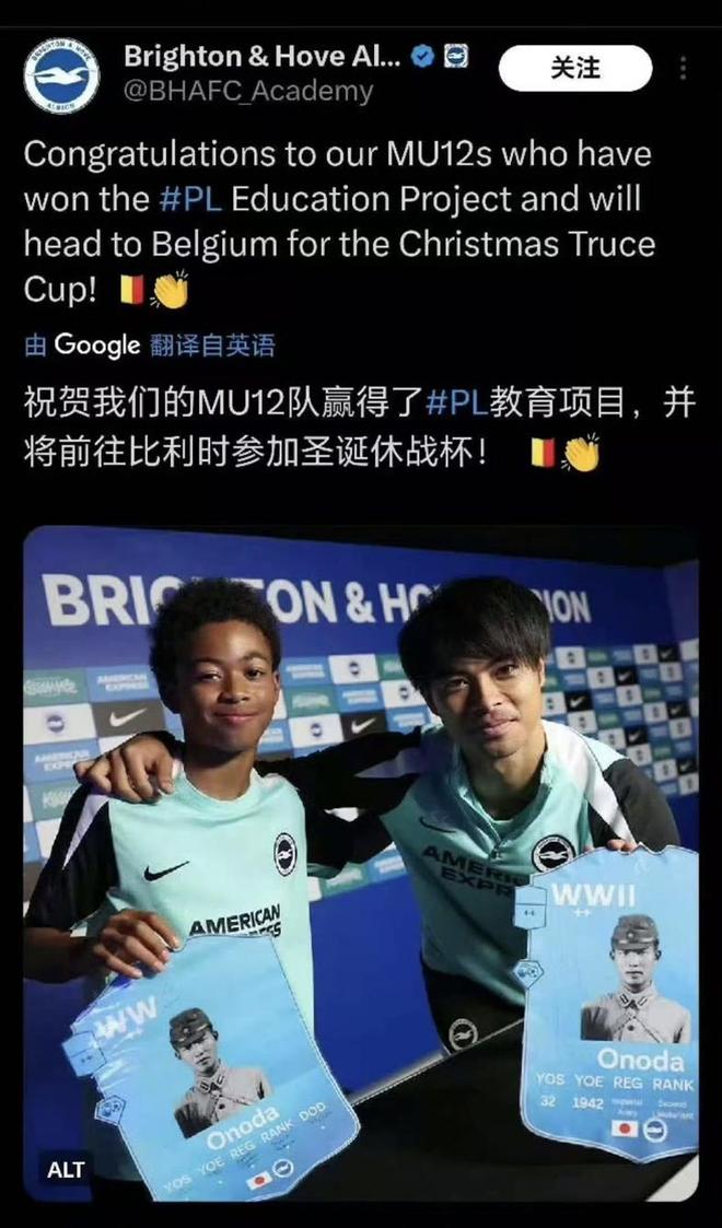日前,布萊頓青訓學院官方賬號發(fā)布了一張照片,引爆全球,不單局限于足壇了:照片中,布萊頓足球俱樂部一線隊日本籍球員三笘薰與一名小球員合影,二人手持類似球員卡的卡片??ㄆ喜⒉皇乔騿T頭像,而是一個日本軍人。經(jīng)查,該日本軍人名叫小野田寬郎,是第二次世界大戰(zhàn)時的日本陸軍少尉。